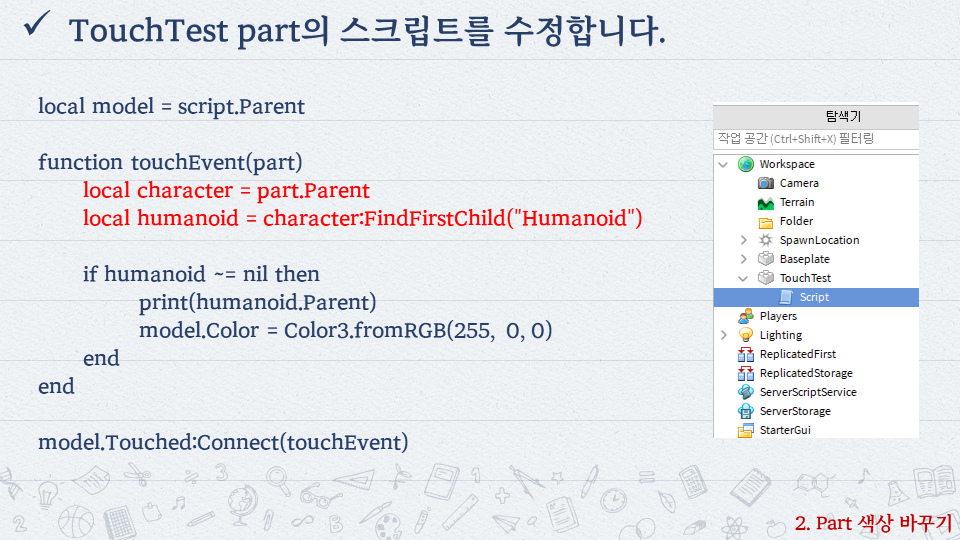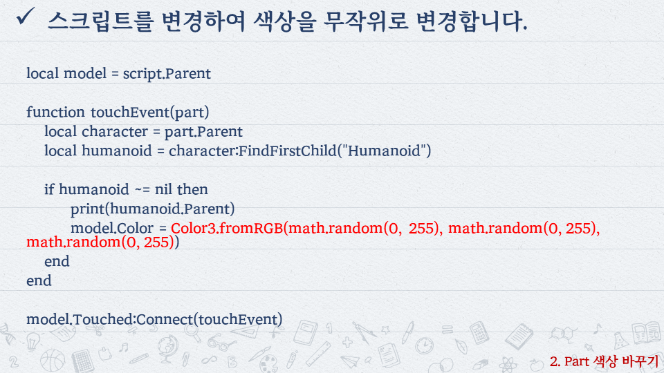 | 로블록스로 배우는 코딩 #6 - 용암을 밟으면 HP가 줄어들어요 (0) | 2022.10.06 |