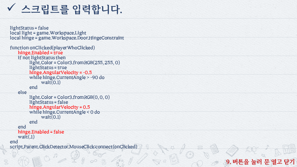 | 로블록스로 배우는 코딩 #8 - 버튼을 눌러 전등 끄고 켜기 (0) | 2022.10.06 |