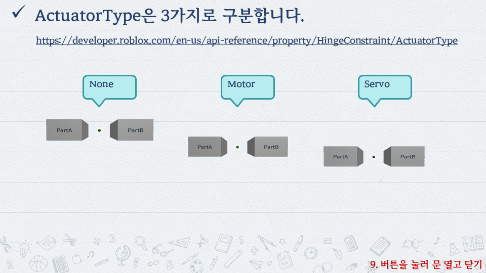 | 로블록스로 배우는 코딩 #10 - 캐릭터 속성(속도, 높이, 크기 등) 제어 (0) | 2022.10.06 |