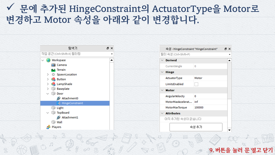 | 로블록스로 배우는 코딩 #10 - 캐릭터 속성(속도, 높이, 크기 등) 제어 (0) | 2022.10.06 |