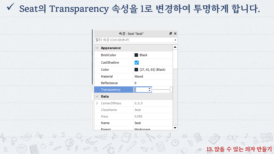 | 로블록스로 배우는 코딩 #10 - 캐릭터 속성(속도, 높이, 크기 등) 제어 (0) | 2022.10.06 |