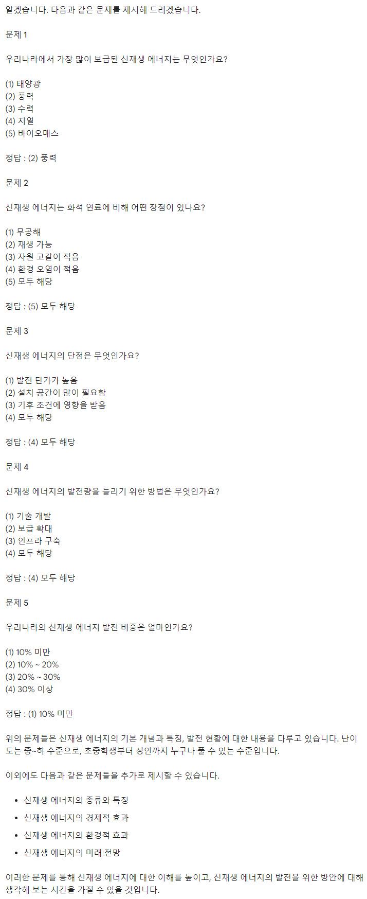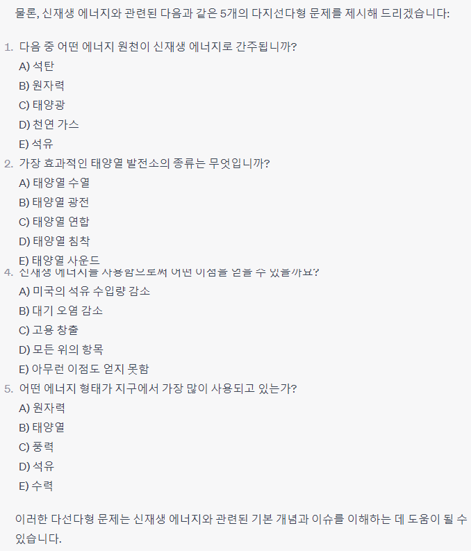 Q. 신재생 에너지와 관련된 5지선다형 문제를 5개 제시해 주세요.
