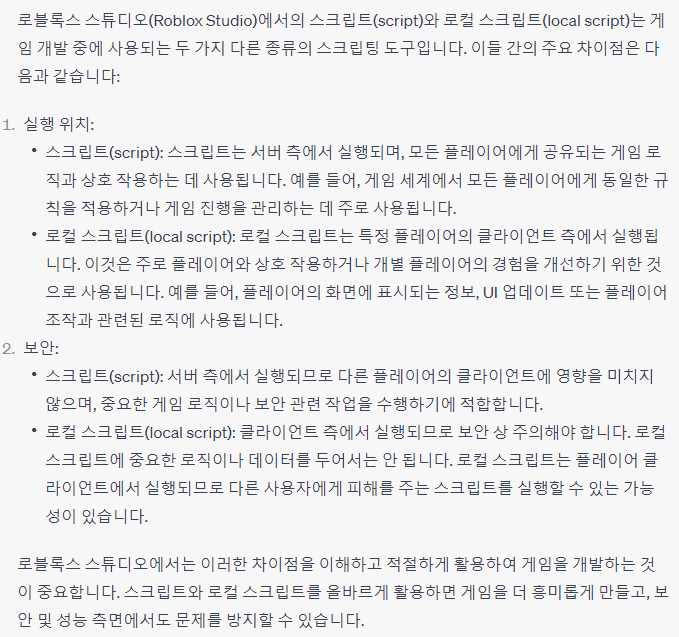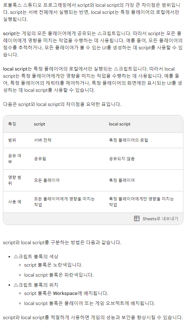 Q. 로블록스 스튜디오 프로그래밍에서 script와 local script의 차이점은 무엇인가?