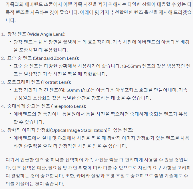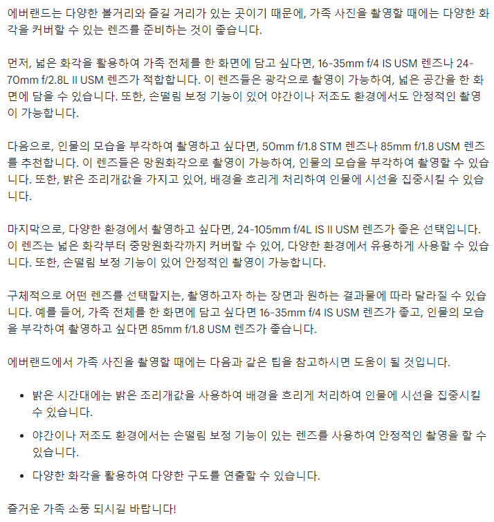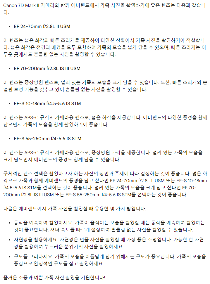 Q2. canon 7d mark 2 카메라를 가지고 가족과 에버랜드로 소풍을 갑니다. 어떤 렌즈를 부착해야 예쁜 가족 사진을 촬영할 수 있을까요?