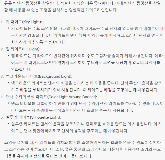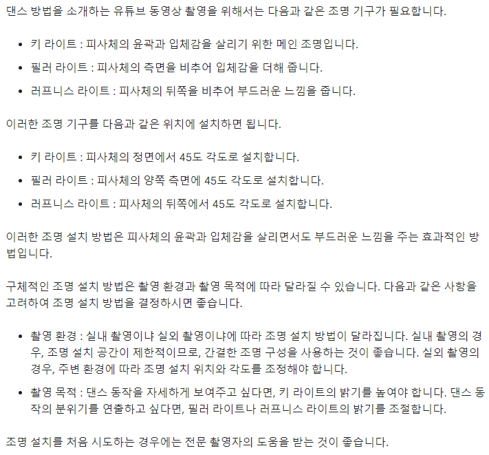 Q. 댄스 방법을 소개하는 유튜브 동영상 촬영을 하려고 합니다. 조명 기구는 무엇을 어떻게 설치해야 할까요?