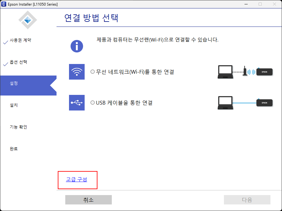 [2] <설정> 단계에서 <고급 구성>을 누릅니다.