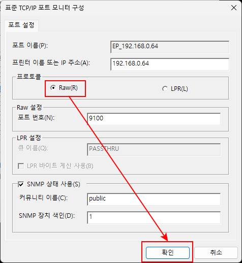[9] 프로토콜을 <Raw>로 선택한 뒤 <확인>을 실행합니다.