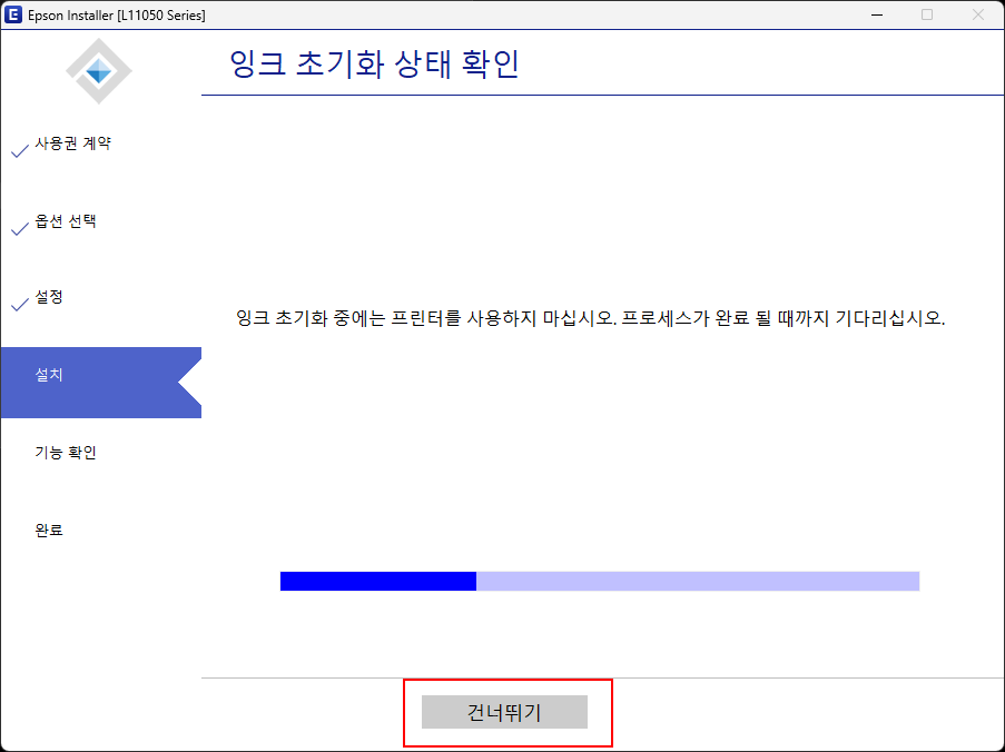 [5] 잉크 초기화 상태 확인은 시간이 오래 걸리므로 <건너뛰기>를 실행합니다.