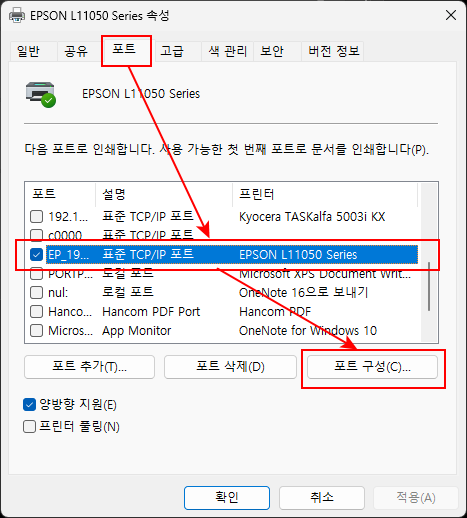 [8] <포트> 탭을 눌러 <포트 구성>을 실행합니다.