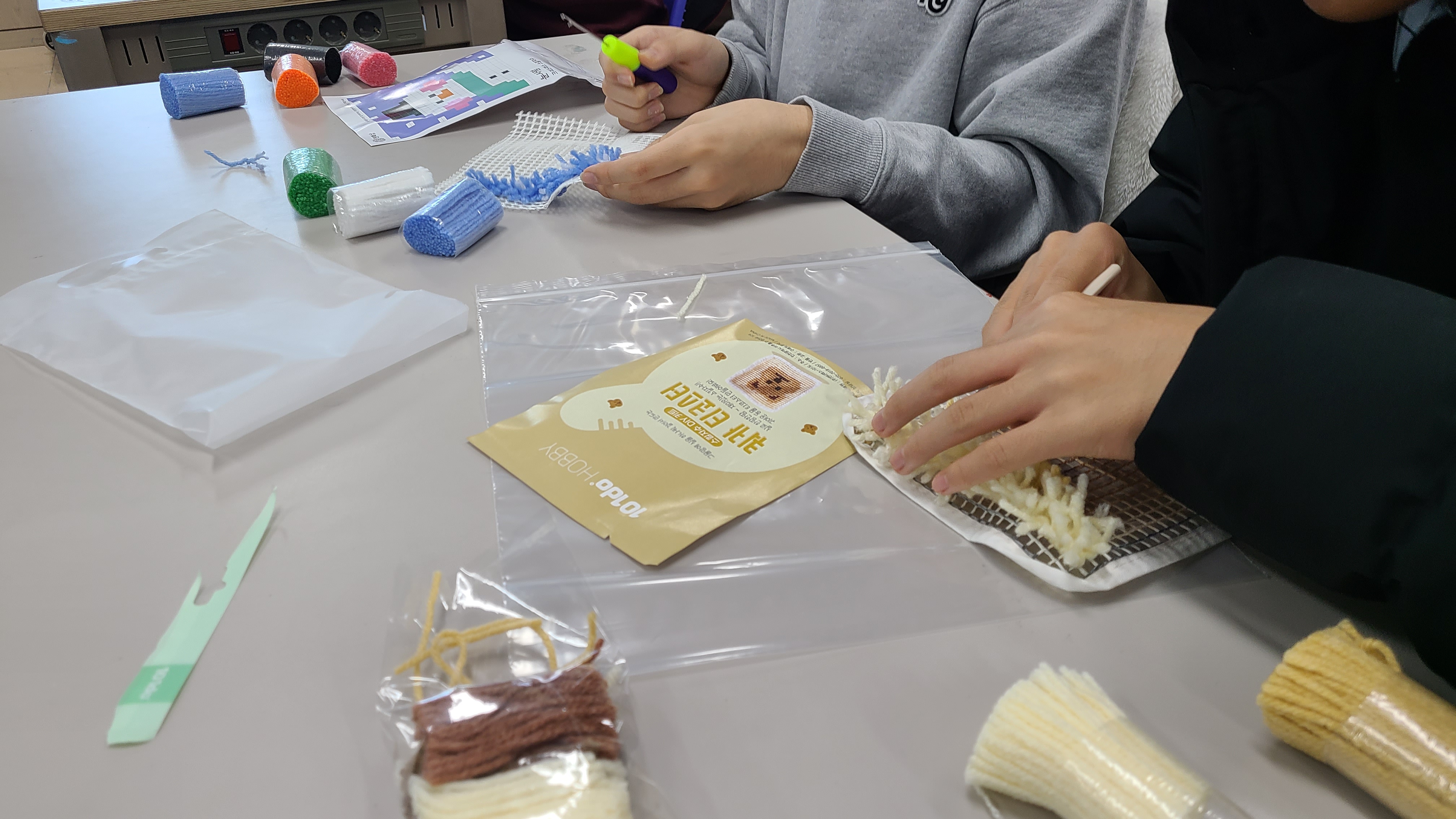 ※ 눈에 보이지 않는 실 가닥이 바늘 입 사이에 끼면 잘 당겨지지 않습니다. 너무 무리해서 당기면 그물망이 끊어집니다. 선생님에게 도움을 요청해 보세요.^^