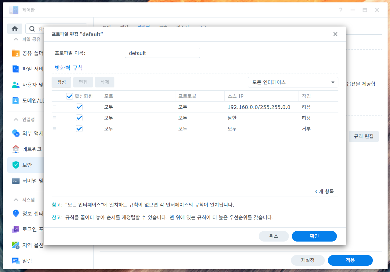 [1] <제어판>-<보안>-<방화벽> 화면에서 <규칙 편집> 실행