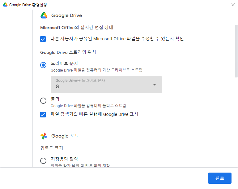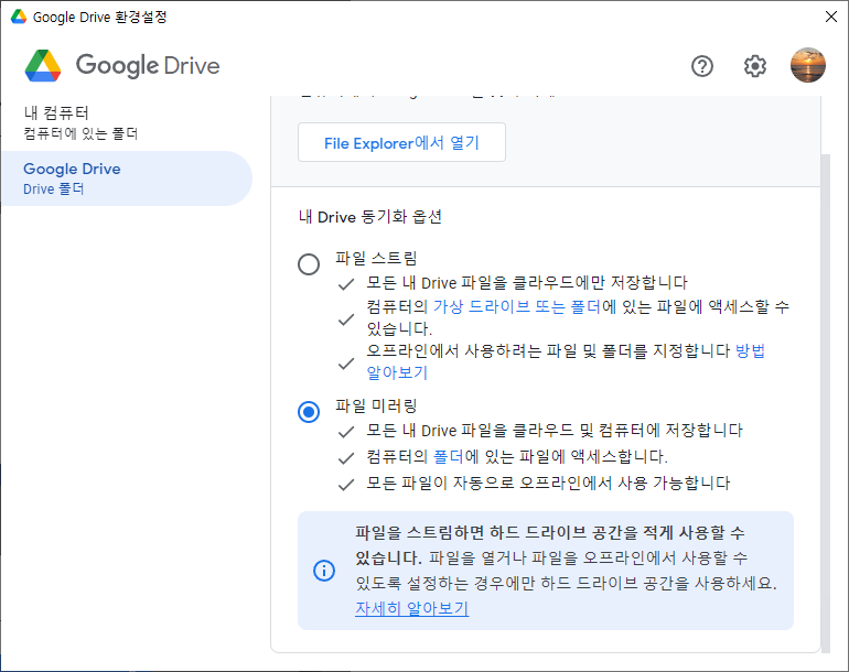 구글 드라이브 - 파일 스트림과 파일 미러링
