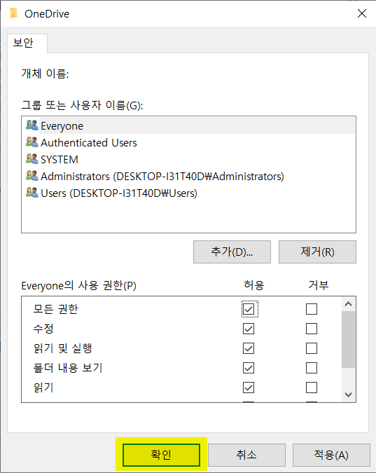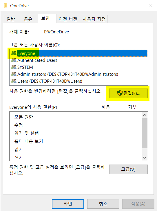 [3] <보안> 탭에서 Everyone을 선택하고 <편집>을 실행합니다.