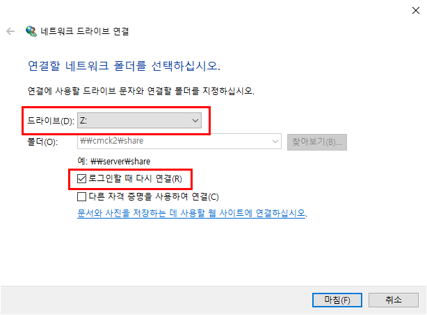 [4] 원하는 드라이브 이름을 선택하고 로그인할 때 다시 연결 을 활성화 합니다.